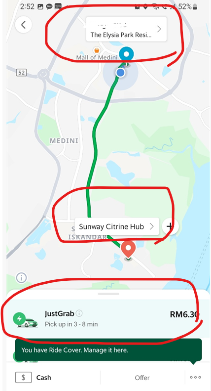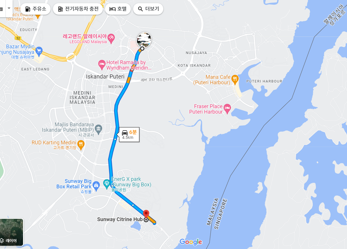 아래는 지금 앨리시아에서 시트린 허브로 가는 거리입니다. 4.5킬로입니다. 택시로 6분 거리죠. 그랩 잡으면 7RM(링깃)이 나옵니다.