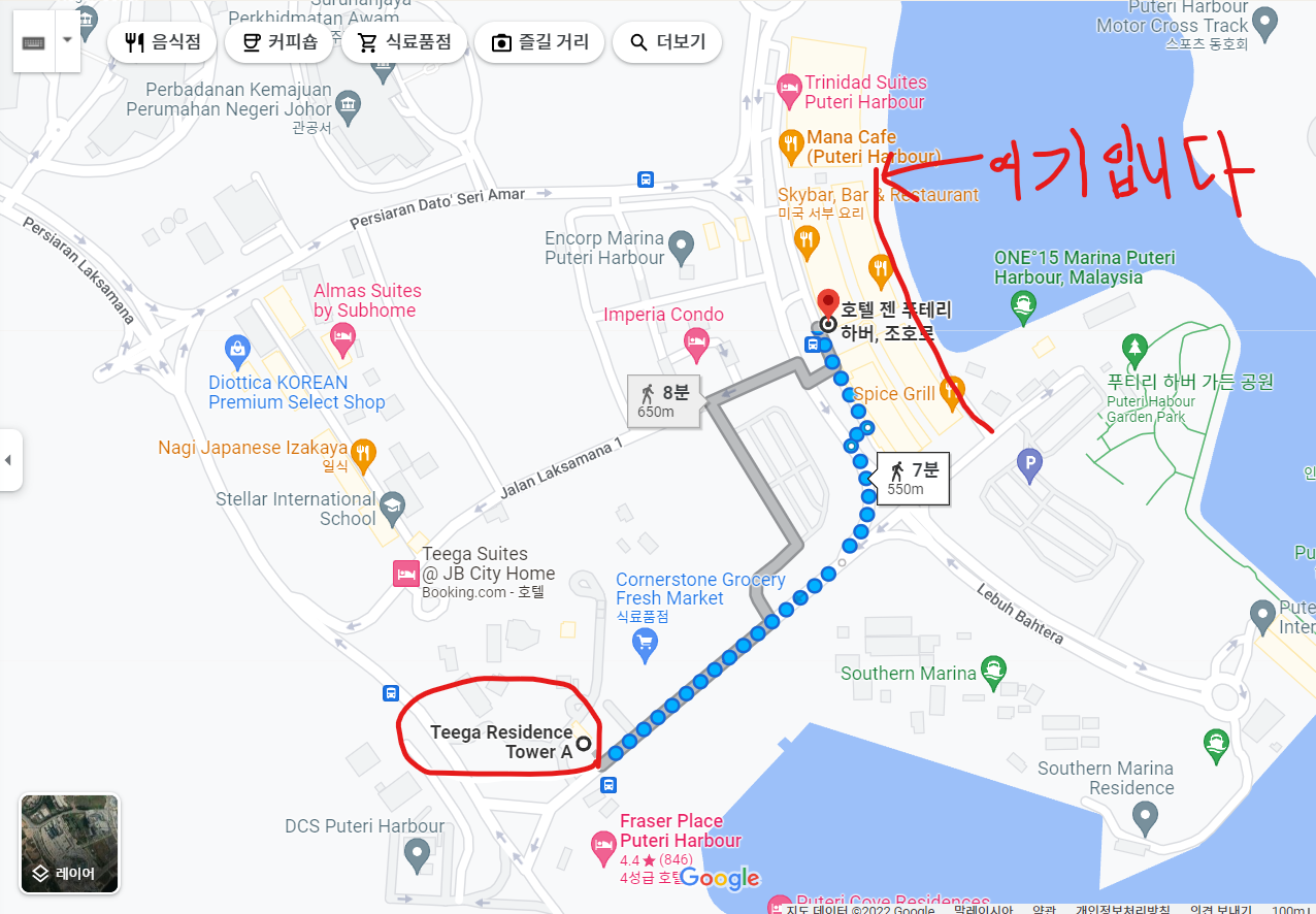 그 이유는 첫 번째가 부산 같은 해변 분위기를 느끼고 싶고, 저녁에 해변가에서 맥주 한잔하고 산책하고 하는 게 좋아서 그런 생활을 꿈꿔서 인데요. 그런데 푸테리 하버는 금,토 저녁에 폭주족들이 몰려와서 잠을 자기 너무 힘들다고 하는 글들을 봐서 제가 가입한 카페 사장님께서