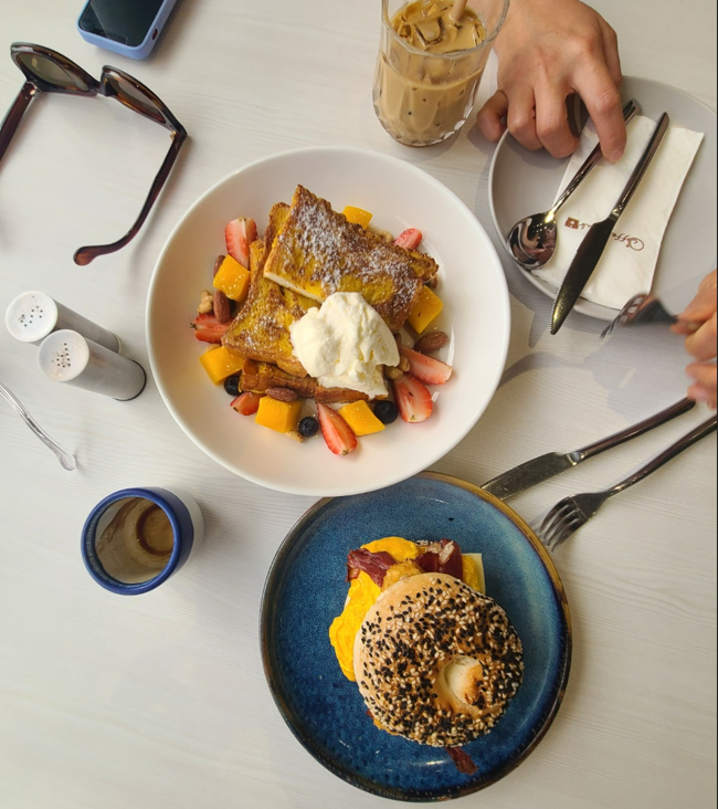 아래 사진은 저희가 주문했던 베이글과 프렌치 토스트 입니다